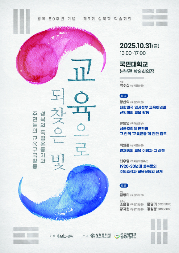 서울 성북구(구청장 이승로)는 오는 10월 31일(금), 성북문화원(원장 김영일)과 국민대학교 한국사연구소가 공동 주관하는 광복 80주년 기념 제9회 성북학 학술회의 ‘교육으로 되찾은 빛’을 개최한다고 밝혔다.