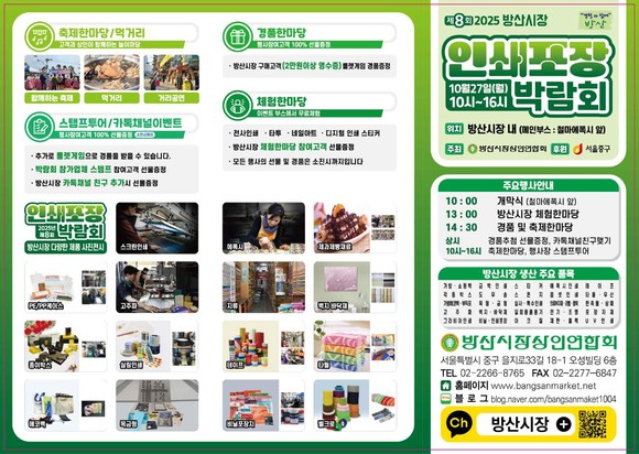 현장에는 타투 체험과 먹거리 부스 등이 마련돼 누구나 즐기며 참여할 수 있다. 또한 방산시장 카카오톡 채널 친구를 추가하면 선물이 주어지고, 2만원이상 구매한 고객은 룰렛 게임을 통해 경품을 받을 수 있다.