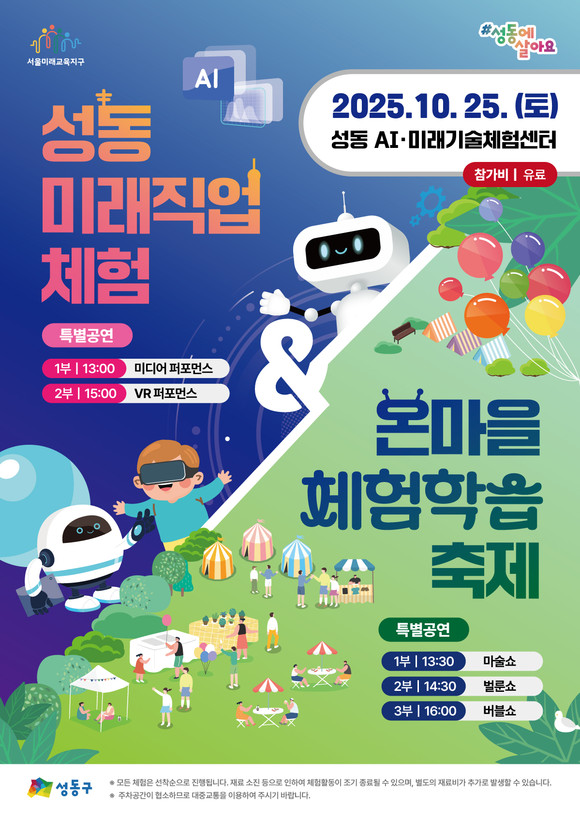 서울 성동구(구청장 정원오)가 오는 10월 25일 성동 AI‧미래기술체험센터 일대에서 '성동 미래직업체험 & 온마을체험학습 축제'를 개최한다고 밝혔다.