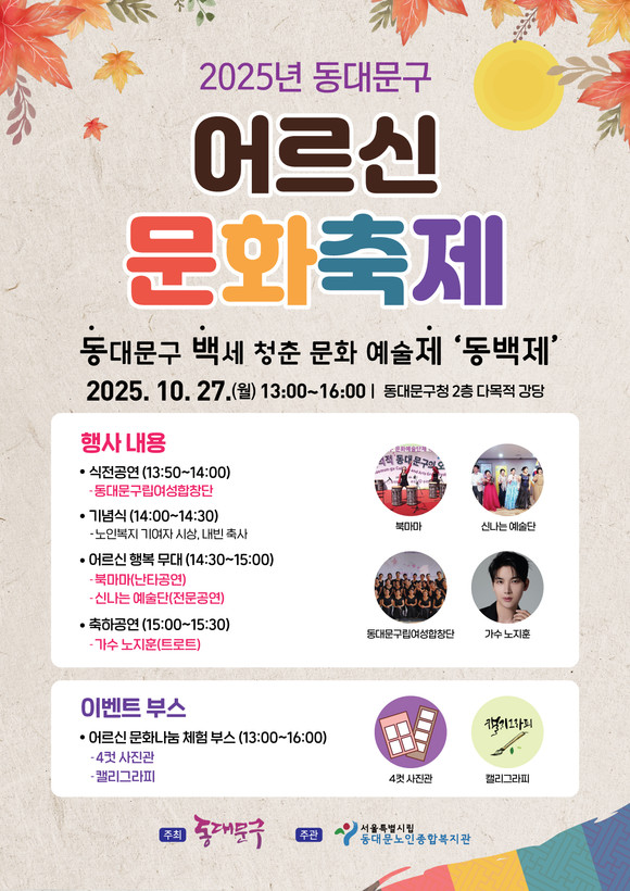 이번 축제는 지역 어르신들에게 다양한 공연과 문화 체험의 기회를 제공하기 위해 마련된 자리로, 동대문노인종합복지관(관장 김윤태)이 주관한다. 행사에는 관내 어르신 및 지역주민 등 800여 명이 참여할 예정이다.