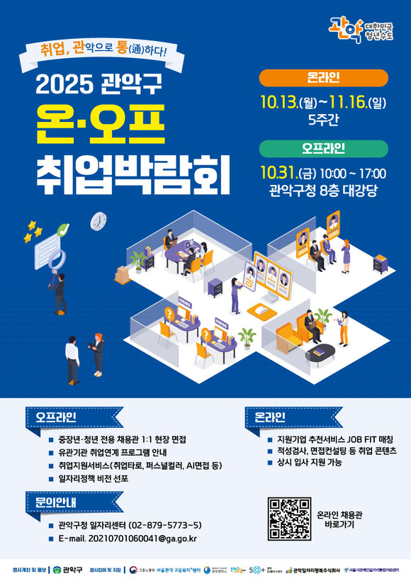 오프라인 채용관은 오는 10월 31일 관악구청 8층 대강당에서 10시부터 17시까지 진행된다. 현장 면접이 가능한 ‘채용관’ 외에도 ▲유관기관 취업지원 프로그램 안내 ▲인공지능(AI) 면접 ▲취업타로 상담 ▲퍼스널컬러 진단 ▲이력서 사진촬영 등 다양한 부대행사도 마련된다.