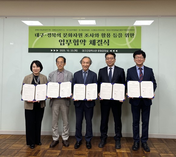 (재)대구문화예술진흥원 박물관운영본부(본부장 신형석)와 경북대학교 영남문화연구원(원장 정병호) 및 퇴계연구소(소장 정병호), 대구섬유박물관(관장 박미연), 대구 동구 팔공문화원(원장 이춘희), (사)팔공산문화포럼(회장 홍진규)은 대구·경북지역의 문화자원 조사와 연구·활용 등을 위한 공동 협력 체계를 구축하고 각종 사업을 추진하기 위해, 10월 23일(목) 협약을 체결하였다.