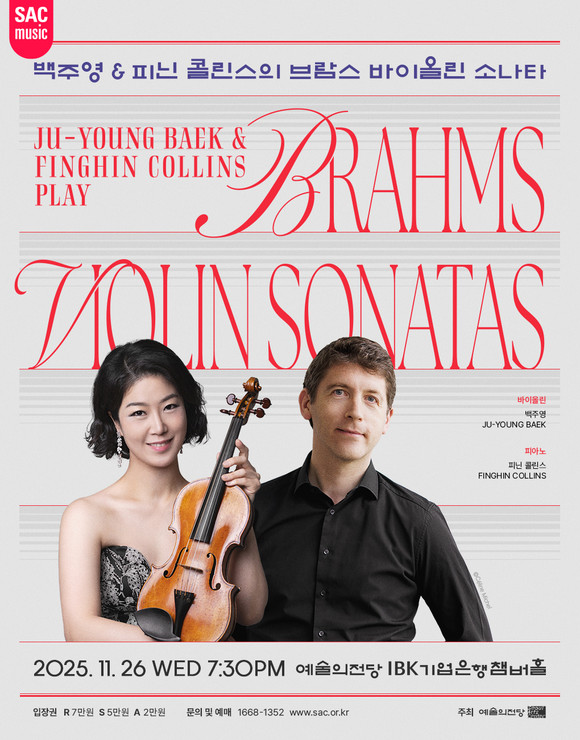 예술의전당은 오는 11월 26일(수) IBK기업은행챔버홀에서 <백주영 & 피닌 콜린스의 브람스 바이올린 소나타>를 선보인다. ‘2025 예술의전당 앙상블시리즈’의 마지막 공연이자 국내 대표 바이올리니스트 백주영과 아일랜드 피아니스트 피닌 콜린스가 함께하는 이번 무대는, 브람스의 바이올린 소나타 전곡을 한자리에서 연주해 낭만주의 실내악의 깊이와 감정의 스펙트럼을 온전히 경험할 수 있는 특별한 무대다.