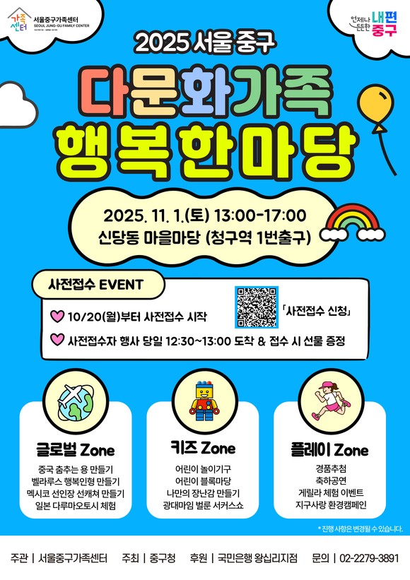 행사는 서울중구가족센터(센터장 정주원)센터가 주관하는 이번 행사는, 다문화가족과 주민 등 400여 명이 한자리에 모여 서로의 문화를 이해하고 어울리는 소통과 화합의 장으로 꾸며진다.