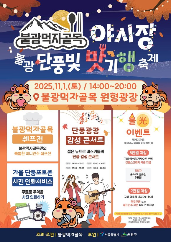 서울 은평구(구청장 김미경)는 내달 1일 오후 2시부터 8시까지 불광먹자골목 원형광장 일대에서 ‘불광 단풍빛 맛기행’ 축제를 개최한다고 밝혔다.