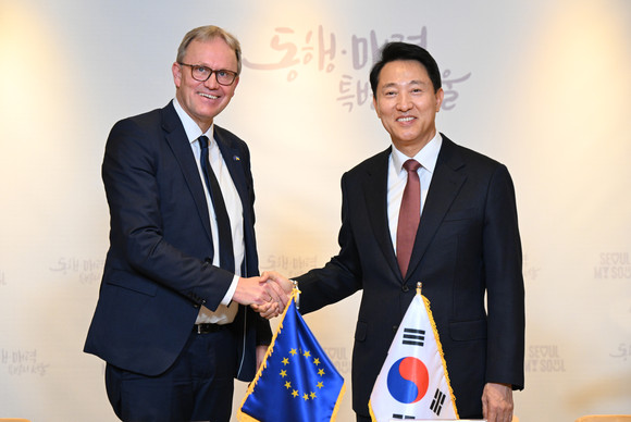 오세훈 서울시장은 28일(화) 오후 4시 40분 서울시청 집무실에서 옌스 기에세케(Jens Gieseke) 대표단장을 비롯한 유럽의회 교통관광위원회 소속 의원들을 만나 서울시 교통정책과 첨단교통 미래 비전을 공유했다.