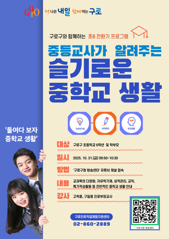 서울 구로구(구청장 장인홍)가 10월 31일 초등학교 6학년 학생과 학부모를 대상으로 중학교 입학 전 알아야 할 주요 정보를 안내하는 ‘슬기로운 중학교 생활’ 프로그램을 유튜브 생방송으로 운영한다.