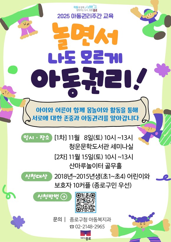 정문헌 구청장은 “다양한 형태의 아동권리교육을 통해 아동은 자신의 권리를 인식하고 존중받는 경험을, 성인은 이해와 실천의 태도를 기를 수 있다”라며 “앞으로도 아동과 함께 성장하고 소통하는 도시, 종로를 실현하기 위해 내실 있는 아동친화정책을 지속적으로 추진하겠다”라고 말했다.