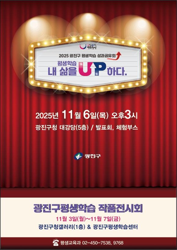 서울 광진구(구청장 김경호)는 11월 3일부터 7일까지 5일간 ‘평생학습, 내 삶을 업(UP)하다’를 주제로 ‘2025 광진구 평생학습 성과공유회’를 개최한다.