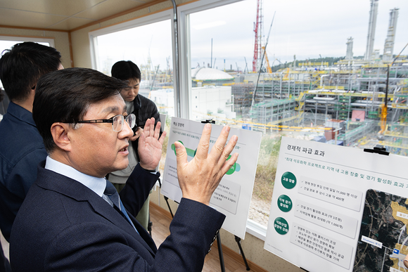 김성환 기후에너지환경부 장관이 30일 울산광역시 울주군 온산산업단지 내 에쓰오일 ‘샤힌 프로젝트’ 건설 현장을 방문해 추진 현황과 공정 효율, 탄소저감 효과를 점검하고 있다. 사진=기후에너지환경부