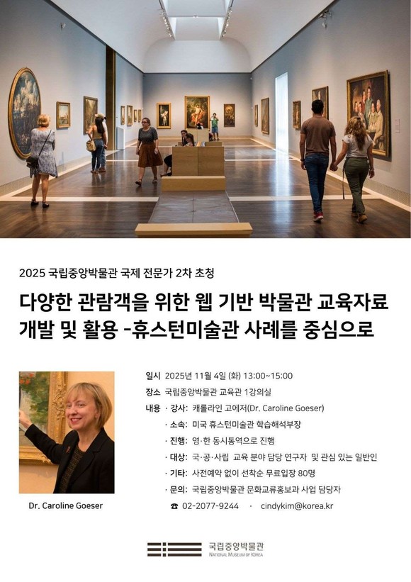 국립중앙박물관(관장 유홍준)은 오는 11월 4일(화), 휴스턴미술관(Houston Museum of Art)의 학습해석부를 총괄하고 있는 캐롤라인 고이저(Caroline Goeser) 박사를 초청해 특별강연을 개최한다.