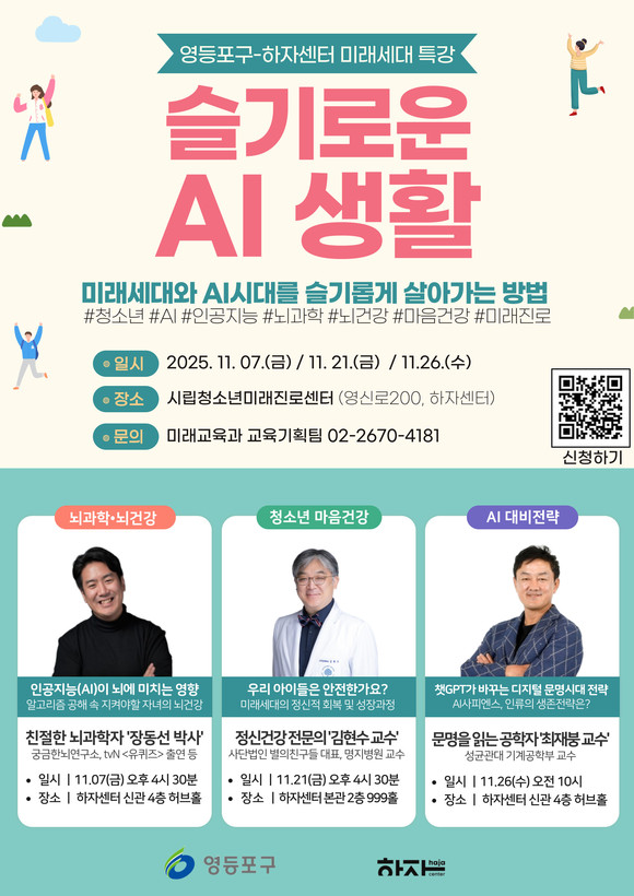 최호권 영등포구청장은 “인공지능 시대에 청소년에게 꼭 필요한 주제를 다룬 이번 강연을 통해 미래세대가 균형 잡힌 시각과 주체적인 사고력을 키우길 바란다”라며 “청소년의 올바른 성장을 지원하는 다양한 교육 프로그램을 확대해 나가겠다”라고 전했다.