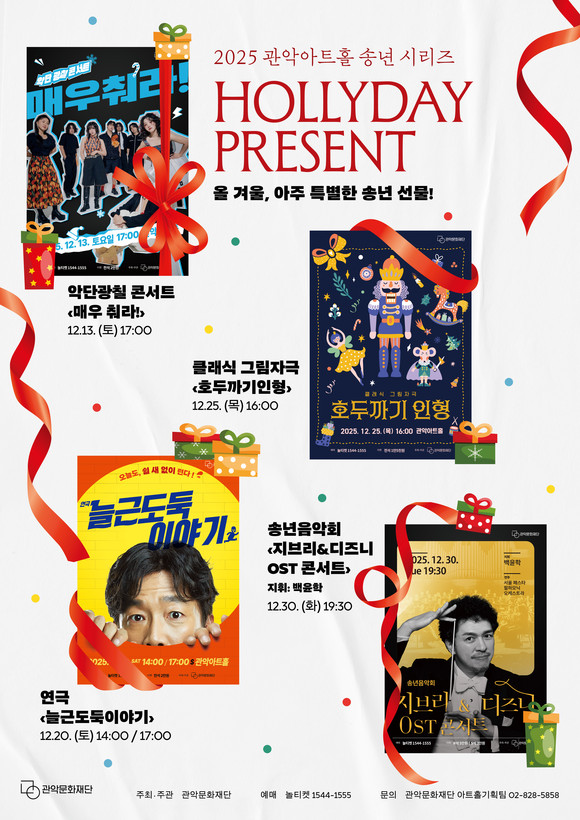 재단은 올해 송년시리즈를 ‘특별한 연말 선물세트’을 주제로, 다양한 세대가 부담없이 즐길 수 있는 공연으로 채웠다. 악단광칠 콘서트 <매우 춰라!>, 연극 <늘근도둑이야기>, 클래식 그림자극 <호두까기인형>, 송년음악회 <지브리&디즈니 OST 콘서트> 등 다양한 공연을 만나볼 수 있다.
