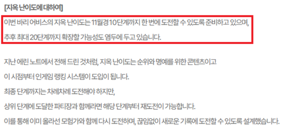 넥슨은 10월 개발자 노트를 통해 “이번 바리 어비스의 지옥 난이도는 11월경 10단계까지 한 번에 도전할 수 있도록 준비 중이며, 추후 최대 20단계까지 확장할 가능성도 염두에 두고 있다”고 밝혔다.