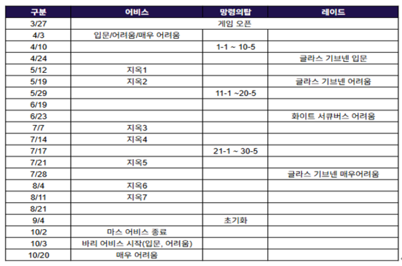 먼저 어비스 콘텐츠는 지난 4월 3일 ‘가라앉은 유적’, ‘무너진 제단’, ‘파멸의 전당’으로 구성된 ‘마스 어비스’가 입문·어려움·매우 어려움 난이도로 최초 공개되면서 시작됐다.
