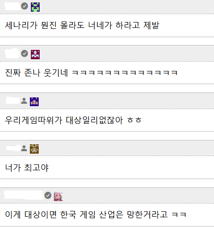 마비노기 모바일 유저 커뮤니티에서는 “얘네가 대상 받으면 앞으로 유저 의견은 더 개무시할 거다”, “유저인 우리가 이 게임을 인정하지 않는데 누가 상을 주냐”, “이런 게임이 대상이면 한국 게임산업은 그냥 수준 미달”이라는 냉소적 반응이 쏟아지고 있다.