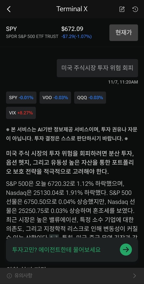 터미널엑스가 '미국 주식시장 투자 위험 회피'에 대한 답변을 제시하고 있다. 사진=NH투자증권