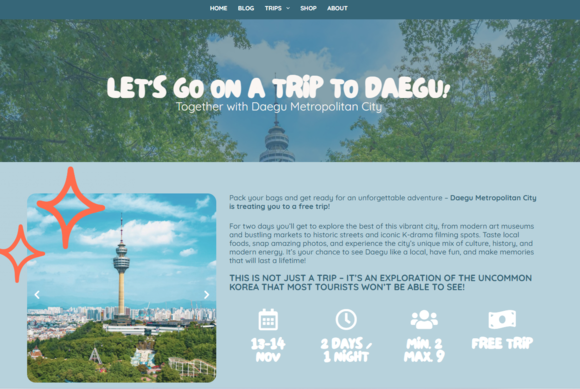 이번 홍보 행사는 ‘여행 인플루언서가 추천하는 특별한 대구여행’을 주제로, 인플루언서 ‘안체(Antje)’(이하 안체)의 SNS 채널(@nextstopkorea)을 통해 모집된 외국인 참가자들이 K-Culture와 연계된 대구의 주요 관광지를 체험하는 방식으로 진행된다. 모집은 지난 10월 21일에 진행되었으며, 게시 후 1시간 만에 마감될 정도로 뜨거운 반응을 얻었다. 참가자는 독일, 미국, 호주, 네덜란드 등 다양한 국적의 20~50대 외국인 관광객으로 구성되어 있다.
