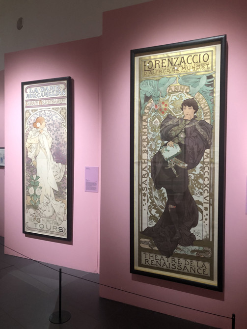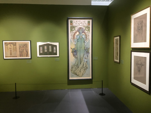 섹션1은 ‘사라 베르나르와 연극 예술’은 무하가 파리 시절 전설적인 배우 사라 베르나르(1844~1923)를 위해 제작한 첫 포스터 ‘지스몽다’(1894)에서 시작된다. 중세 그리스를 배경으로 한 지스몽다는 빅토리앙 사르두의 희곡을 바탕으로 사라 베르나르가 직접 제작·연출하고 주연을 맡은 첫 작품이다. 1895년 새해 첫날 파리 전역에 걸린 지스몽다 포스터는 화제가 됐고, 이 성공을 계기로 베르나르는 무하에게 6년간의 전속 계약을 제안했다. 무하는 단순한 디자이너를 넘어 예술감독으로서 의상, 장신구, 무대장치까지 총괄하는 역할까지 맡으며 추가 포스터 6점을 제작했다.