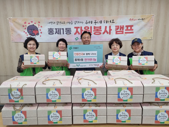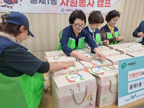 서울 서대문구 홍제1동(동장 이상구)은 최근 동 자원봉사캠프가 관내 취약계층 홀몸어르신과 한부모가정 20여 곳에 전통한과를 선물해 주위를 훈훈하게 했다고 11일 밝혔다.