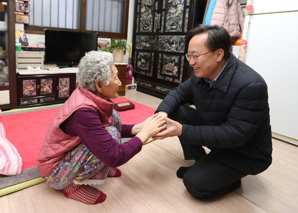 유성훈 금천구청장이 홀몸어르신 가구를 방문해 안부를 묻고 있다. 사진=금천구청