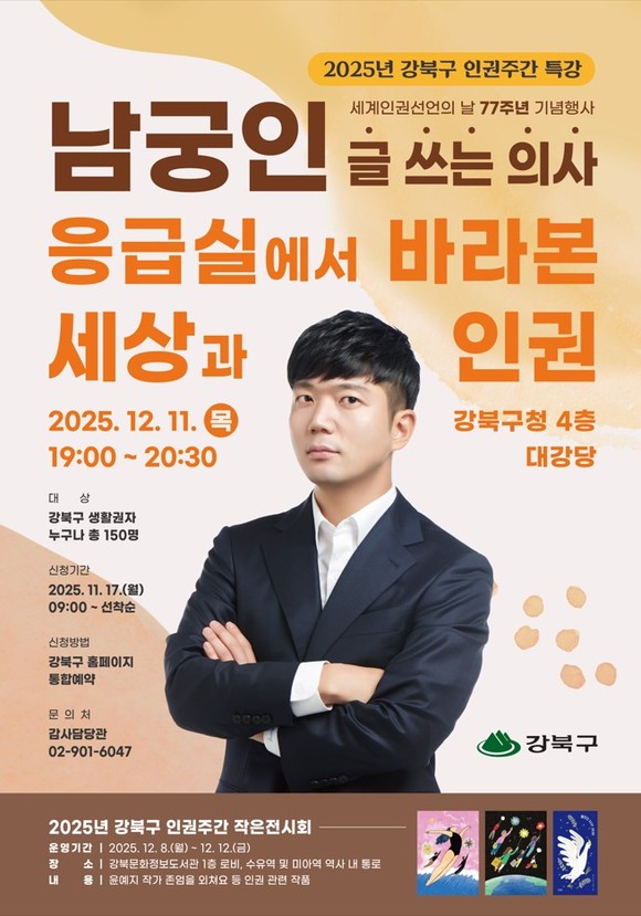 서울 강북구(구청장 이순희)는 오는 12월 11일(목) 오후 7시, 강북구청 대강당에서 ‘2025년 세계인권선언의 날 기념 명사특강’을 개최한다고 밝혔다.