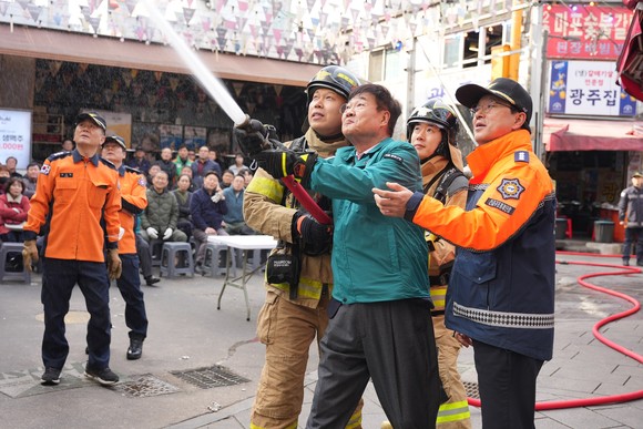 훈련은 상생거리 상인과 주민을 대상으로 소화기 사용법 교육, 시연에 이어 실제 화재 발생을 가정한 화재 감지 및 신고, 초기 소화 활동, 비상소화장치 방수 실습 으로 구성됐다. 아울러 소방차를 활용한 화재 진압 및 구조 작업 등을 통해 안전사고 대응 능력을 높였다. 정문헌 구청장 또한 이날 안전사고 대응체계 점검을 위해 함께했다.