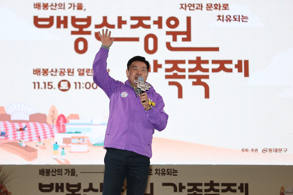 지난 15일 '배봉산정원 가족축제'에서 인사말하는 이필형 동대문구청장. 사진=동대문구청