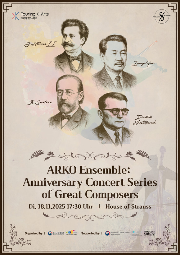 한국문화예술위원회(위원장 정병국, 이하 아르코·ARKO)는 오는 11월 18일(화) 오스트리아 빈 House of Strauss, 11월 20일(목) 체코 프라하 주체코대사관 이벤트홀에서‘ARKO Ensemble: Anniversary Concert Series of Great Composers’를 개최한다고 밝혔다. 아르코 앙상블이 유럽 음악 중심지에서 마련하는 공식 순회 공연이다.