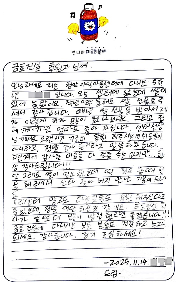 이번 기부에선 금호건설 직원들에게 특별한 선물도 전해졌다. 청암지역아동센터를 이용하는 초등학생들이 정성을 담아 작성한 감사의 손편지와 롤링페이퍼다.