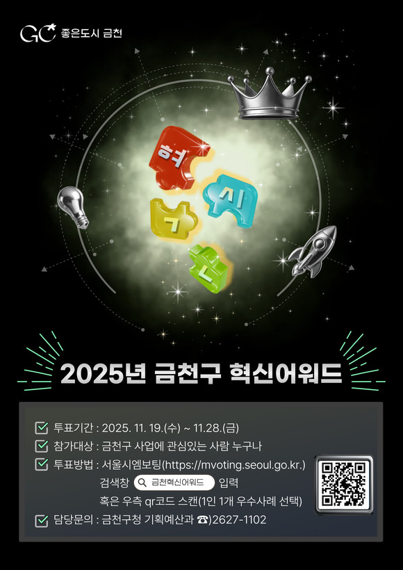 서울 금천구(구청장 유성훈)는 11월 19일(수)부터 11월 28일(금)까지 10일간 ‘2025년 금천혁신어워드’ 온라인 투표를 진행한다고 밝혔다.