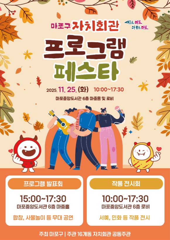 서울 마포구(구청장 박강수)는 11월 25일, 마포중앙도서관에서 ‘자치회관 프로그램 페스타’를 개최한다.