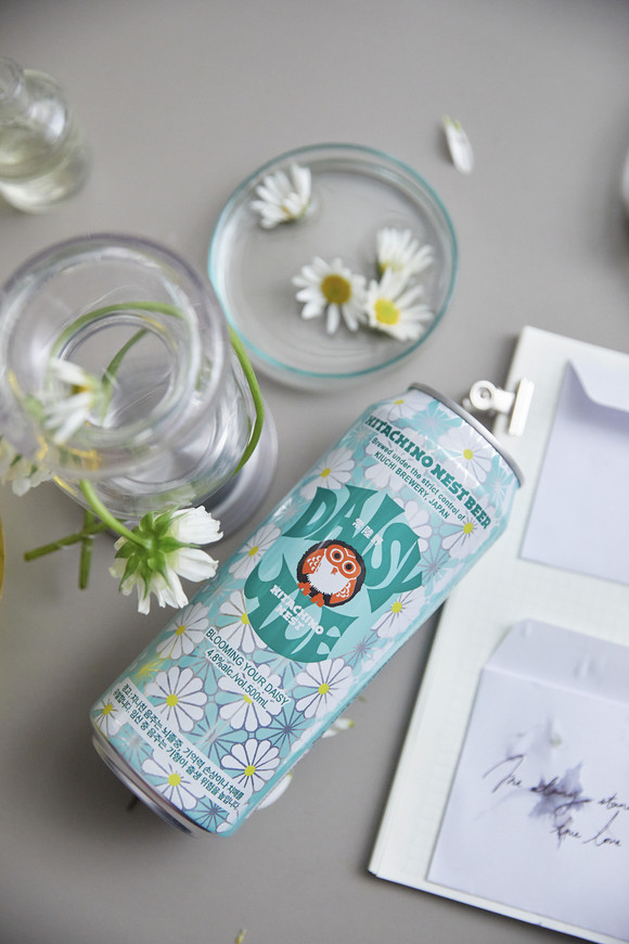 우선, 패키지는 데이지 꽃을 강렬하게 표현해, 단순한 디자인을 넘어 아트워크에 가까운 독창적인 비주얼을 완성했다. 데이지 한 송이를 상징적으로 그려 넣은 게 아니라, 꽃이 흩날리고 번지는 순간의 감정을 패턴으로 확장해, 민트 빛 캔 위에 데이지가 만개한 듯한 그래픽 아트워크로 표현했다. 맛과 품질은 히타치노 네스트의 총괄 양조 책임자가 수많은 테스트를 거쳐 완성했다. 알코올도수는 4.8도.