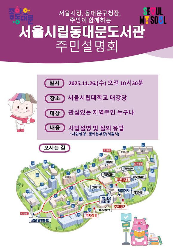 서울 동대문구(구청장 이필형)는 오는 26일 오전 10시, 서울시립대학교 대강당에서 ‘서울시립동대문도서관 건립 주민설명회’를 개최한다고 밝혔다.