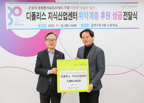서울 금천구(구청장 유성훈)는 디폴리스 지식산업센터에서 ‘G밸리 근로자 문화행사’와 ‘호프데이’ 행사 수익금을 포함한 성금 700만 원을 관내 취약계층을 위해 기부했다고 밝혔다.