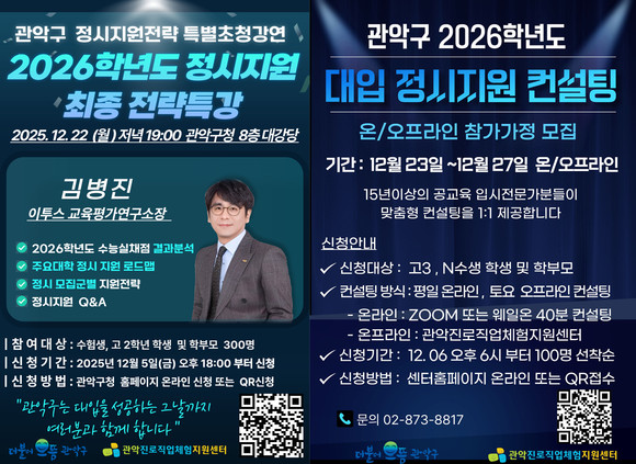먼저 구는 오는 12월 22일 저녁 7시 관악구청 8층 대강당에서 ’2026 정시전략특강‘을 개최한다. 이번 특강에는 대학 입시 전문가인 ’김병진 이투스 소장‘이 출강해 ▲정시 지원 최신 동향 ▲전형 분석 ▲지원 전략 ▲학과 선택 노하우 등을 심층 분석하고 현실적인 지원 방향을 제시할 계획이다.