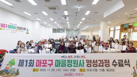 박강수 서울 마포구청장은 11월 26일 오후 2시 20분, 마포구청 12층 중강당에서 열린 ‘제1회 마포구 마을정원사 수료식’에 참석해 양성과정을 마친 주민들에게 직접 수료증을 수여하고 활동을 격려했다.