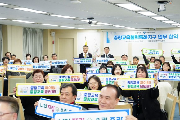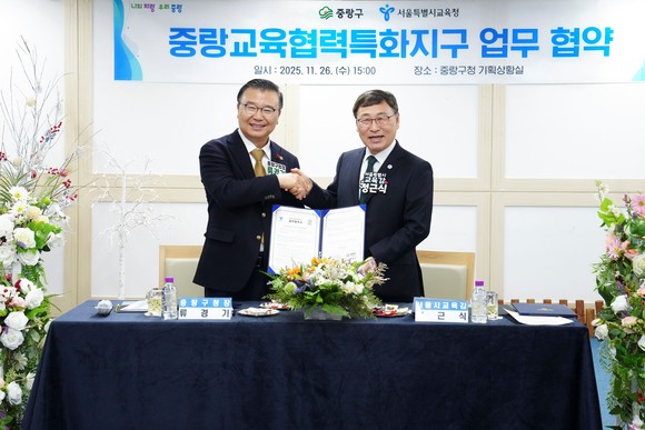 서울 중랑구(구청장 류경기)는 11월 26일 구청 4층 기획상황실에서 서울특별시교육청과 ‘중랑교육협력특화지구’ 업무협약을 체결했다. 이번 협약은 2019년 혁신교육지구, 2023년 미래교육지구 추진에 이어 지역 교육 협력사업을 확장하는 단계로, 구·교육청·학교 간 협력 구조를 체계화해 지역 기반 교육 환경을 강화하기 위해 마련됐다.