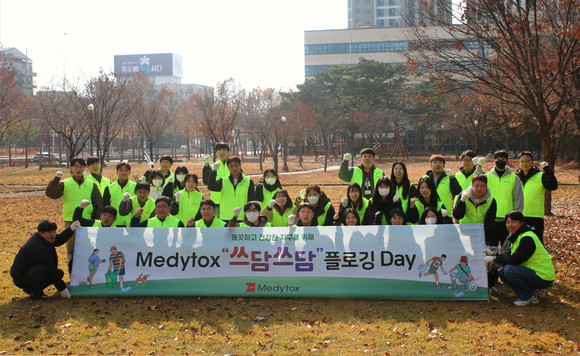 메디톡스 임직원 60여명은 이번 행사에서 1, 2공장 주변 산책로와 환호공원, 각리근린공원 일대 생활쓰레기를 수거했다. 폐현수막을 재활용한 플로깅백을 사용해 쓰레기 배출을 최소화하는 제로웨이스트도 실천했다.