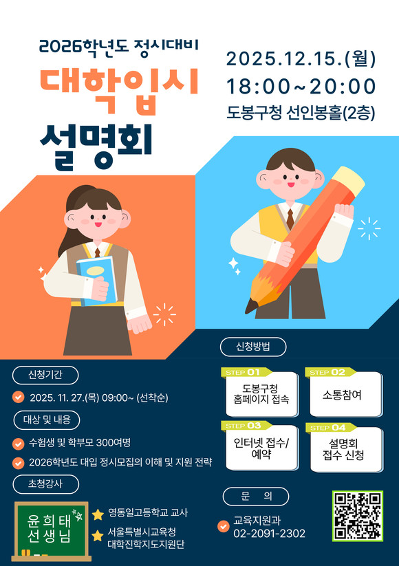 서울 도봉구(구청장 오언석)가 12월 15일 오후 6시 도봉구청 2층 선인봉홀에서 2026학년도 대입 정시 전략 설명회를 개최한다.