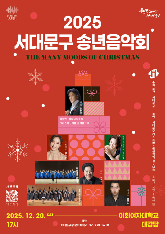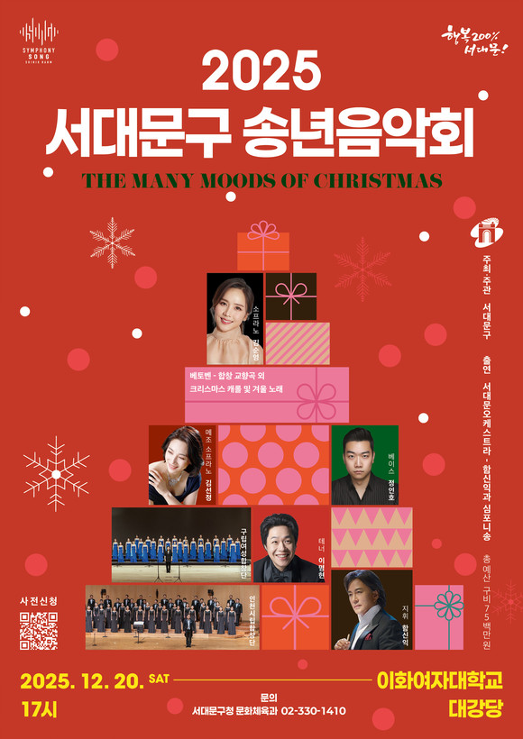 이성헌 서대문구청장은 “한 해를 돌아보고 새해를 준비하는 때에 관객분들께 일상의 따뜻한 위로와 기쁨을 전하는 송년음악회가 될 것으로 기대한다”고 말했다.