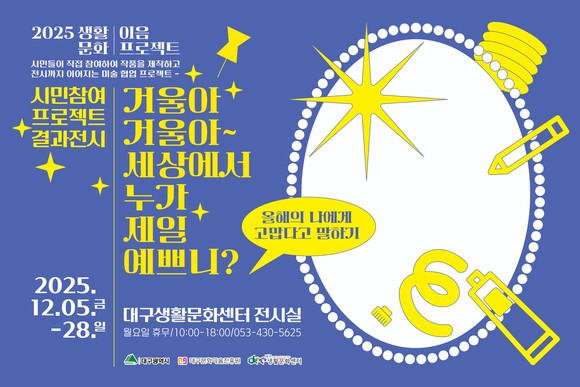 (재)대구문화예술진흥원 대구생활문화센터는 ‘2025 생활문화 이음 프로젝트’ 결과 전시 “거울아, 거울아~ 세상에서 누가 제일 예쁘니?’를 오는 12월 5일(금)부터 12월 28일(일)까지 대구생활문화센터 1층 전시실에서 개최한다.
