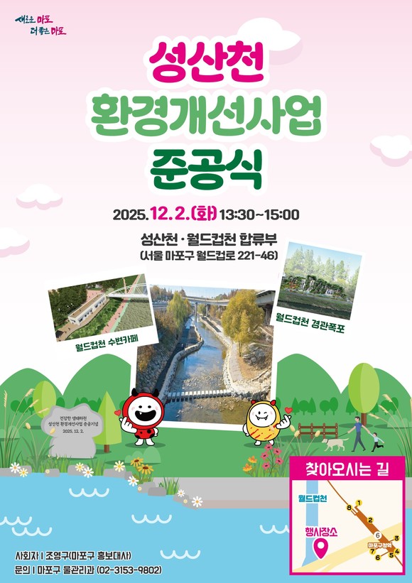 서울 마포구(구청장 박강수)는 사천교~한강 합류부까지 이어지는 성산천 2.4km 구간의 환경개선사업을 완료하고, 12월 2일(화) 오후 1시 30분 성산천·월드컵천 합류부에서 준공식을 개최한다.