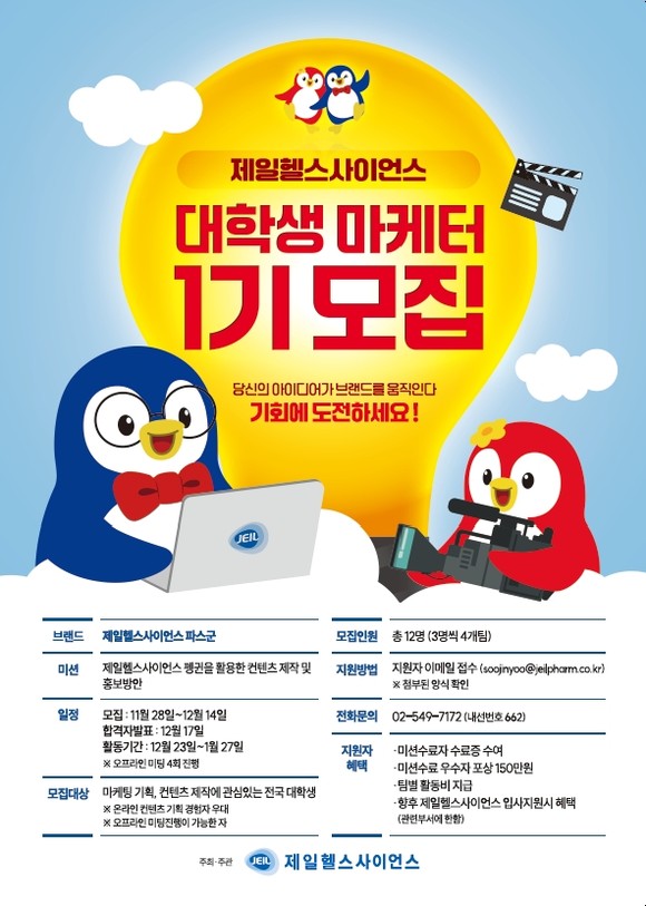 제일헬스사이언스(대표 한상철)가 브랜드 ‘파스군’과 캐릭터 ‘펭귄’을 활용한 콘텐츠 제작과 홍보 기획을 수행할 ‘제일헬스사이언스 대학생 마케터 1기’를 14일까지 모집한다고 3일 밝혔다.