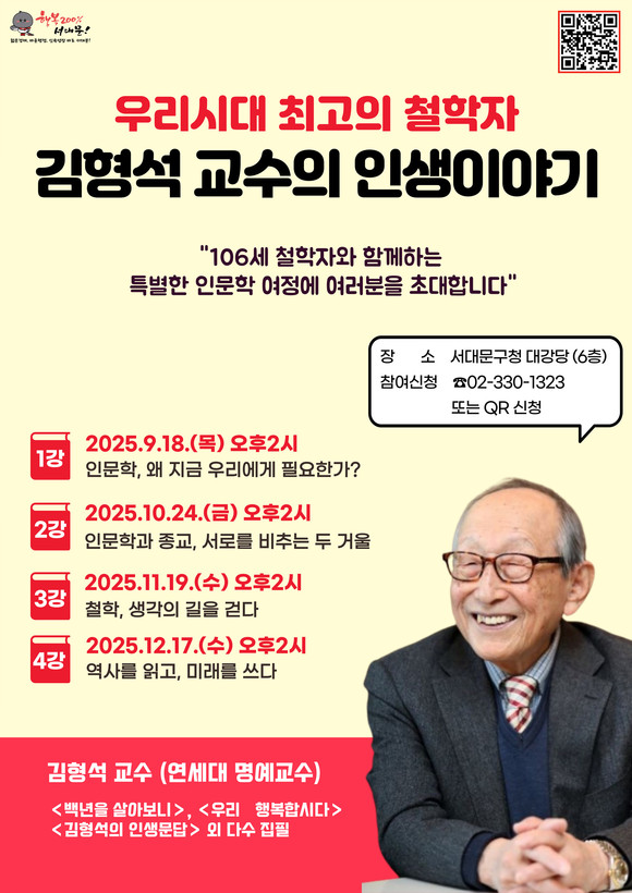 이성헌 서대문구청장은 “그간 김형석 교수님의 경륜과 지혜가 담긴 특강을 통해 삶의 목표와 방향을 찾을 수 있는 귀한 시간이었다”며 “올 한 해를 의미 있게 마무리할 수 있는 이번 강연에도 많은 분의 참여를 기대한다”고 말했다.