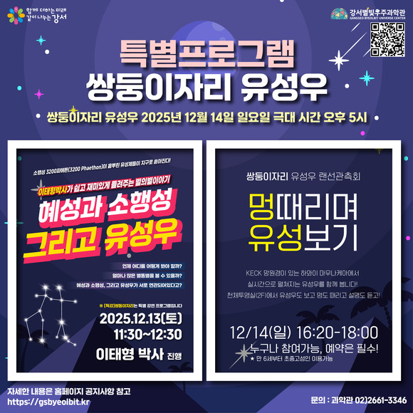 진교훈 구청장은 “이번 연말 프로그램 외에도 천체현상에 맞춘 다양한 특별 프로그램을 꾸준히 마련하겠다”며, “구민들이 별과 우주를 가까이에서 느낄 기회를 지속 확대해 나가겠다”고 말했다.