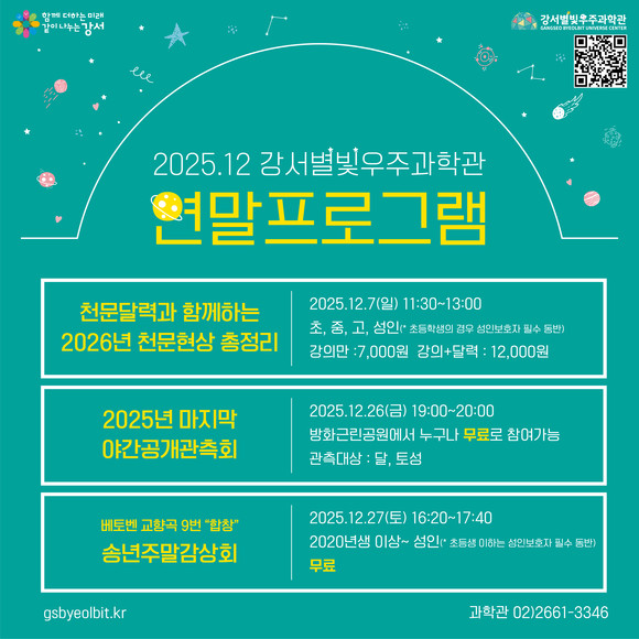 서울 강서구(구청장 진교훈) 강서별빛우주과학관(금낭화로 178)은 연말과 성탄절을 맞아 다채로운 천문 프로그램을 운영한다.