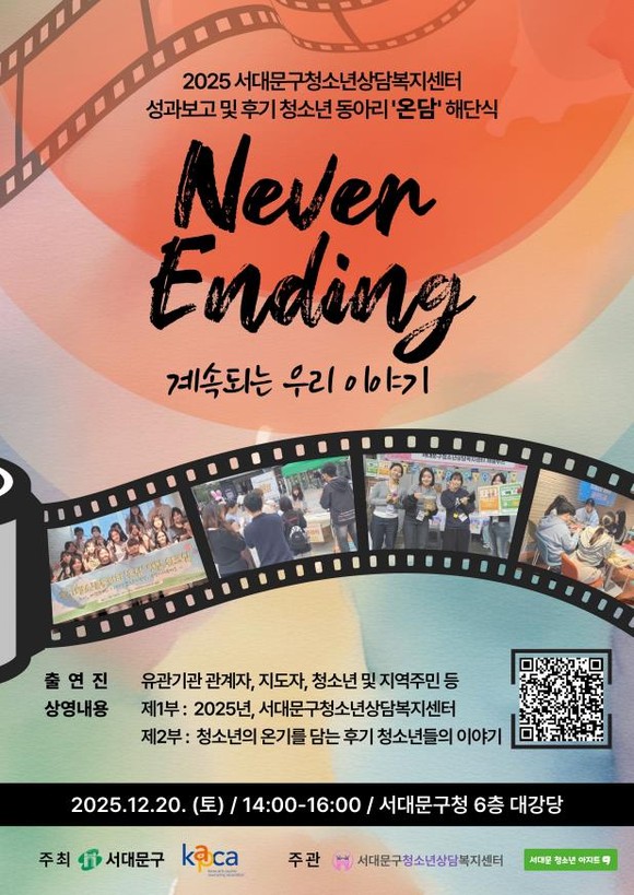서울 서대문구(구청장 이성헌)가 위탁 운영하는 서대문구 청소년상담복지센터(센터장 최후남)가 이달 20일 오후 2∼4시 구청 6층 대강당에서 ‘2025년 성과보고 및 후기청소년(19∼24세) 동아리 온:담 해단식’을 개최한다.
