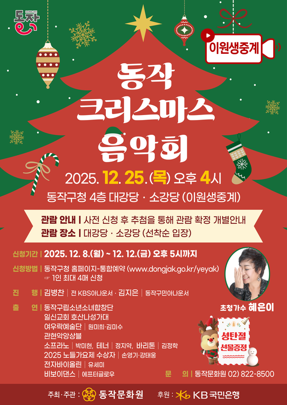 서울 동작구(구청장 박일하)는 오는 25일(목) 오후 4시 구청 신청사에서 ‘동작 크리스마스 음악회’를 개최한다고 밝혔다.