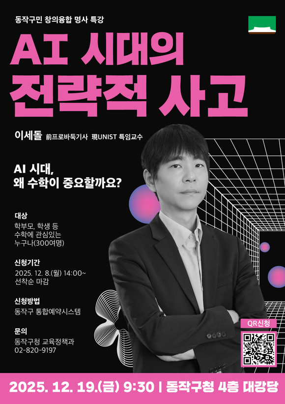 박일하 동작구청장은 “이번 특강이 인공지능 시대에 요구되는 수학적 사고력의 가치와 중요성을 생각해보는 계기가 되길 바란다”라며 “앞으로도 미래 교육 환경 변화에 능동적으로 대응할 수 있는 정책을 지속적으로 확대해 나가겠다”라고 말했다.